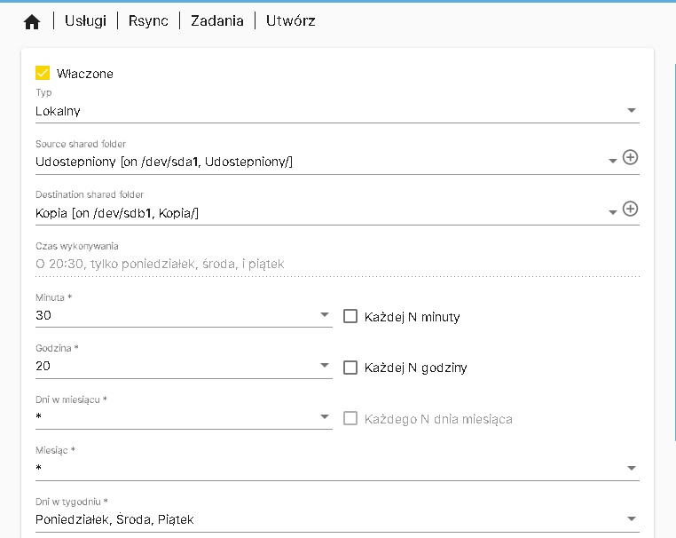 W celu synchronizacji, czy jak kto woli automatycznej kopii plików wykorzystamy wbudowane narzędzie, jakim jest rsyns, umożliwiające w dużym zakresie parametryzację wykonywania kopii. Przechodzimy więc w lewym drzewie kolejno Usługi->Rsync->Zadania. Otworzy się nowe okienko w którym nad tabelką naciskamy ikonkę plusa, która to utworzy nowe zadanie.