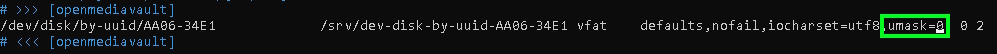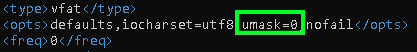 gdzie również wpisujemy w przed ostatniej sekcji umask=0.