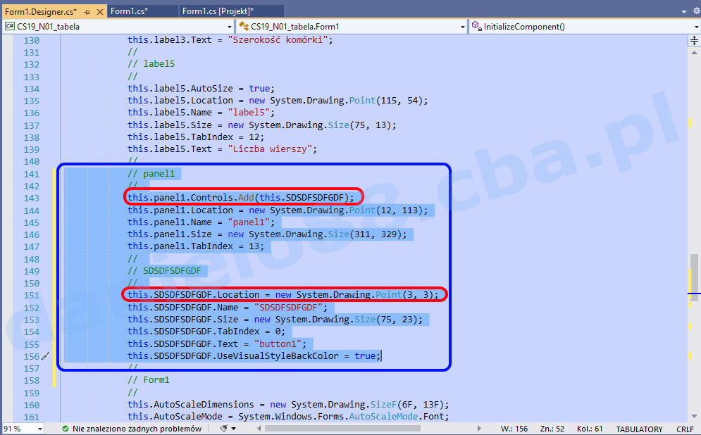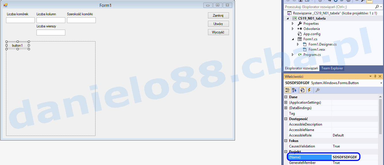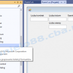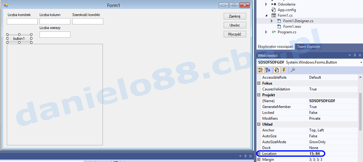 Tabela przekracza obszar formatki. Tym razem tak zmodyfikujemy program, aby możliwe było przewijanie naszej tabeli scrollem. W pierwszej kolejności dodamy panel w którym będziemy umieszczać naszą tabelę – przenosimy ją na naszą formatkę i rozciągamy do odpowiedniej wielkości. A jak umieścić dynamicznie tabelę w tym panelu? Sprawdźmy jak program Visual Studio umieszcza kontrolki w tym panelu. Dodajmy na ten panel przycisk i nazwijmy go jakąś dowolną nazwą tak żeby się wyróżniała ona, łatwiej nam będzie ją odszukać. Następnie przejdźmy do kodu programu w którym tworzone są kontrolki – otwieramy plik Form1.Designer.cs z drzewa projektu. W nim szukamy konfiguracji naszej kontrolki.