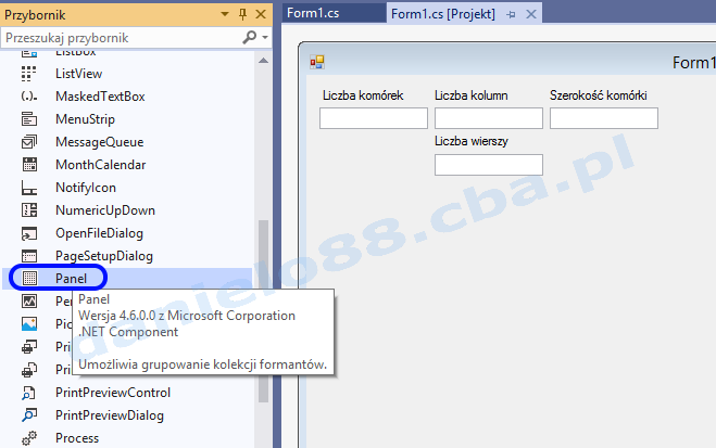 Czyli już chyba wszystko wiemy, więc możemy przejść do modyfikacji programu. Przechodzimy do programu który znajduje się pod przyciskiem utwórz i odnajdujemy fragment który odpowiedzialny jest za umieszczenie kontrolek na formularzu. Musimy go zmienić w ten sposób aby kontrolki pojawiały się na naszym panelu. Najprościej dopisać na początku tej metody że dotyczy ona panelu: