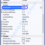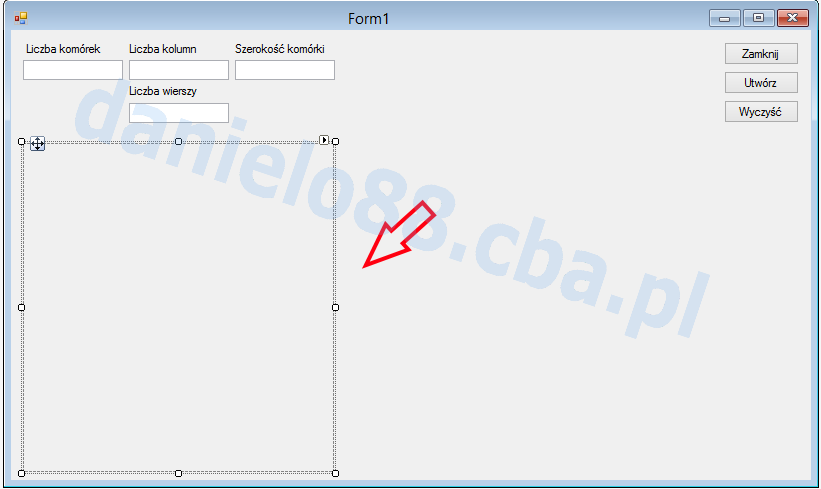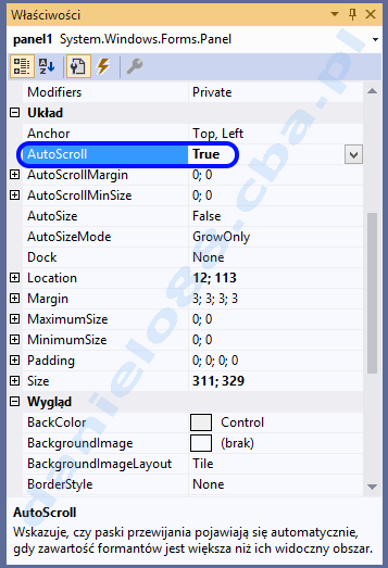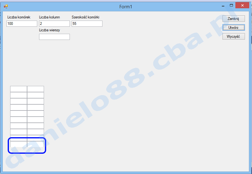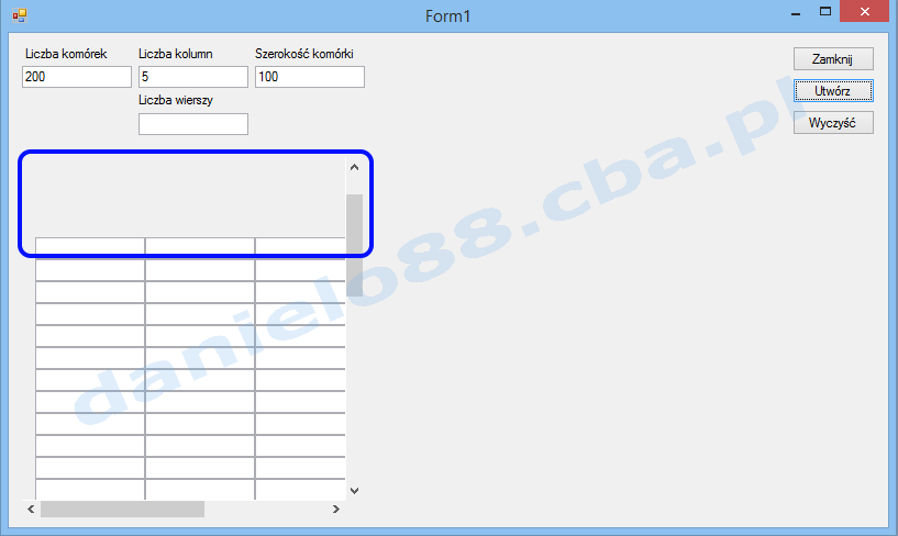 Pamiętajmy też o dopisanie odniesienia do panelu podczas odczytywania pierwszej kontrolki, oraz usuwania kontrolek. Kompilujemy program i uruchamiamy go. W wpisaniu dużej liczby komórek, nadal komórki wychodzą poza formatkę, ale tym razem jak rozciągniemy okno nie pokazują się kolejne komórki – z tego powodu że rozszerzyliśmy formatkę, a nie panel. Aby zobaczyć kolejne komórki, dodajmy możliwość przewijania naszej tabeli. Przechodzimy więc do właściwości naszego panelu i zaznaczamy na True w grupie układ AutoScroll. Uruchamiamy nasz program i wpisujemy ilość komórek np 200, liczbę kolumn np. 5 i szerokość 100. Pojawiła się nam tabela i możliwość jej przewijania. Ale co to się stało – w dziwnym miejscu rozpoczyna się nasza tabela. Zapomnieliśmy zmienić położenie jej. Przechodzimy więc jeszcze raz do kodu i szukamy fragmentu kodu odpowiedzialnego za początkowy punkt każdej kontrolki. Zmieniamy w niej wartość 12 i 110 na wartości 3. Jest to początkowa wartość od której obliczane są następne położenia. Uruchamiamy program i wpisujemy dane jak poprzednio.