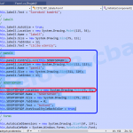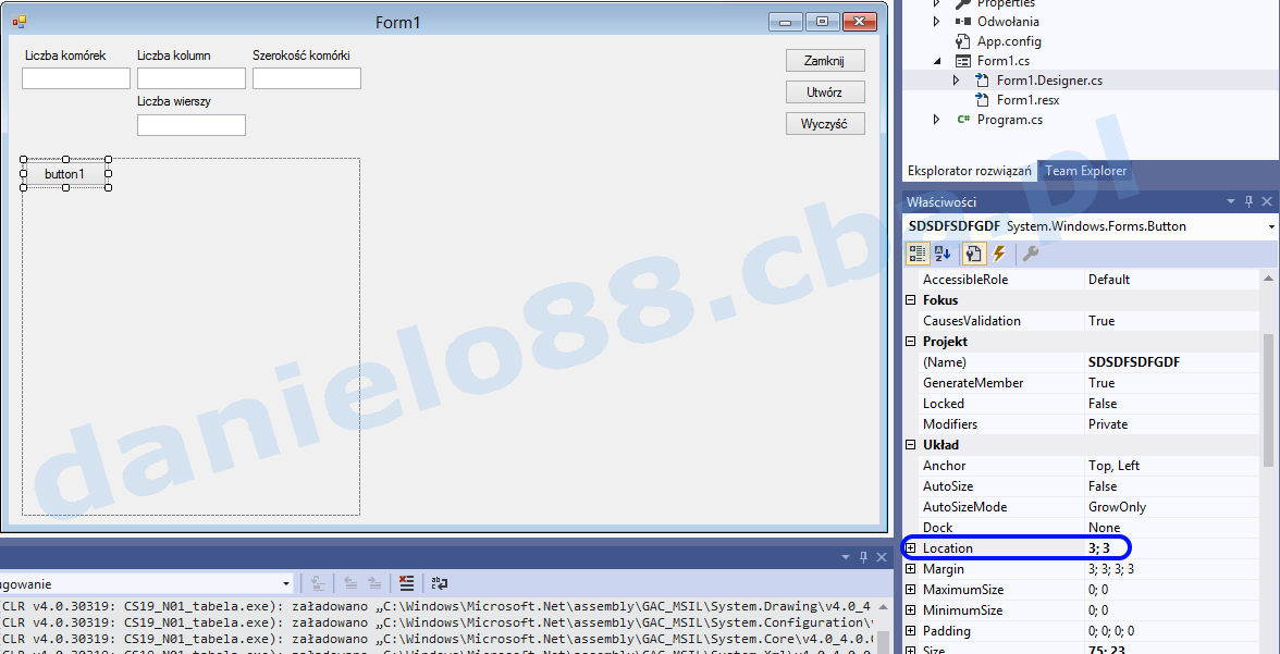 W pierwszej części umieszczana jest kontrolka na panelu poprzez odniesienie się do tego panelu. Natomiast w drugiej części konfigurowana jest ta kontrolka, ale już bez odniesienia do naszego panelu. To już wiemy jak zmodyfikować program. Ale zobaczmy jeszcze na punkt w którym rozpoczyna się rysowanie samej kontrolki przycisku. Jest tutaj niska wartość punktu początkowego sprawdźmy to – przejdźmy do okna projektowego. We właściwościach przycisku odnajdujemy pozycję Location. Przenieśmy przycisk ponad ten panel. Lokalizacja zmieniła się dość dużo. Oznacza to, że panel ma swój układ współrzędnych.