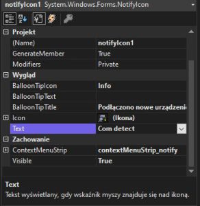 Można również dokonać konfigurację informacji zawartych w powiadomieniu w kodzie programu, wykorzystując odniesienie do właściwości komponentu notifyIcon. Poniżej przedstawiam przykład z autorskiego programu Com detect gdzie wywoływane jest powiadomienie w momencie wykrycia nowego urządzenia – serial port.