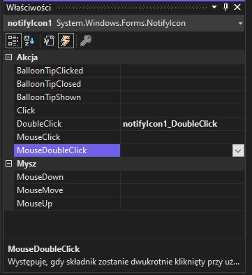 Natomiast w właściwościach zdarzeń, można dodać blok funkcji który będzie wywoływany w przypadku kliknięcia, czy to na powiadomienie, czy na ikonę w pasku tray. Tam zajmiemy się jednak innym razem.